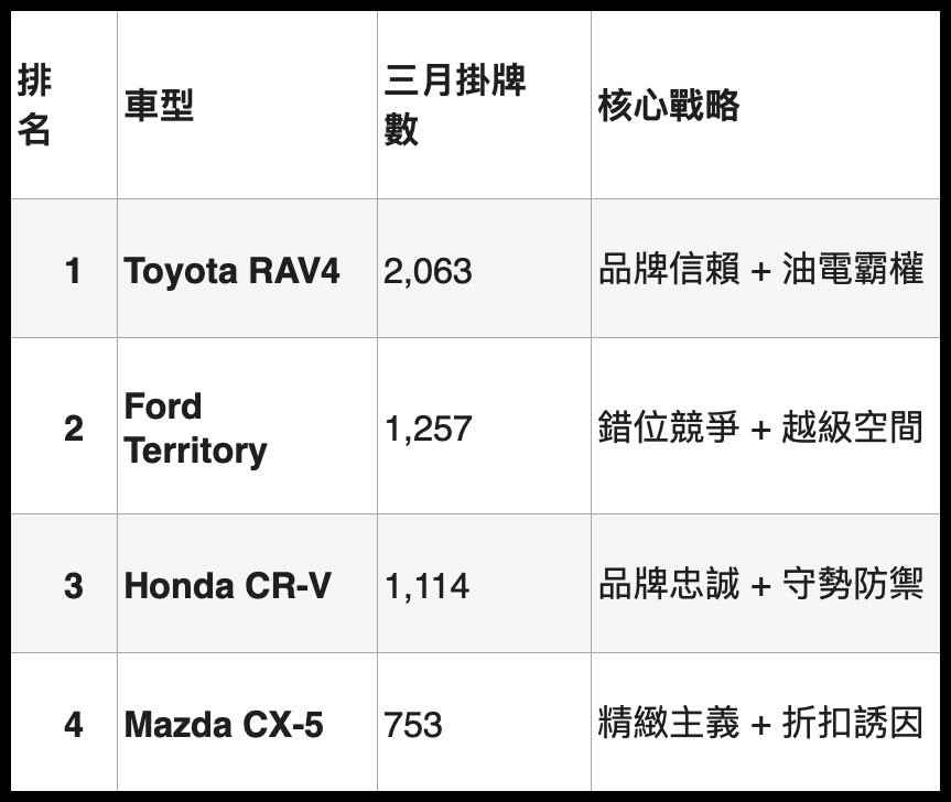 神車RAV4 與黑馬Territory的殊死戰:從 2026 年 3 月車市排行,看見台灣中產階級的焦慮與渴望!