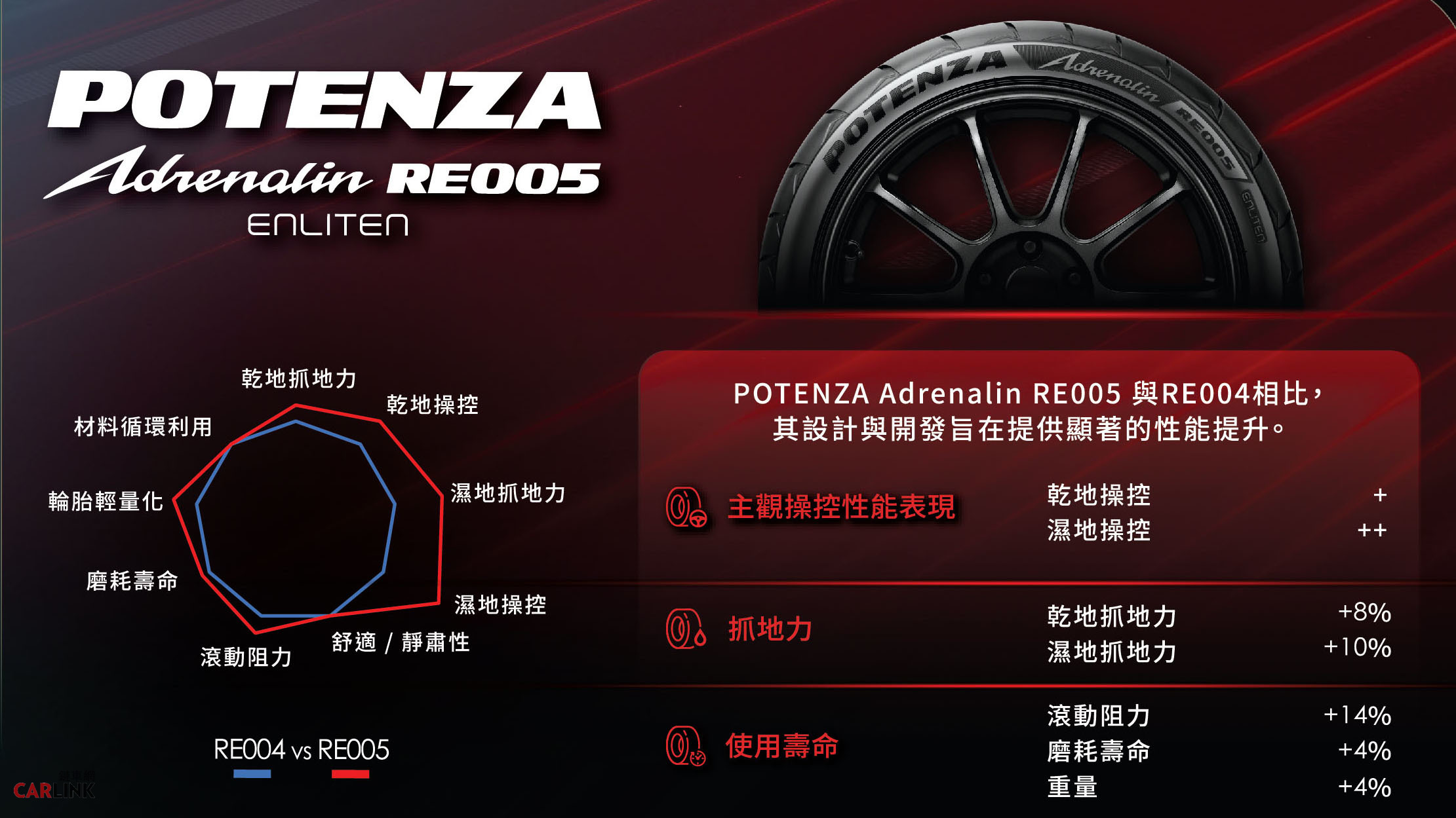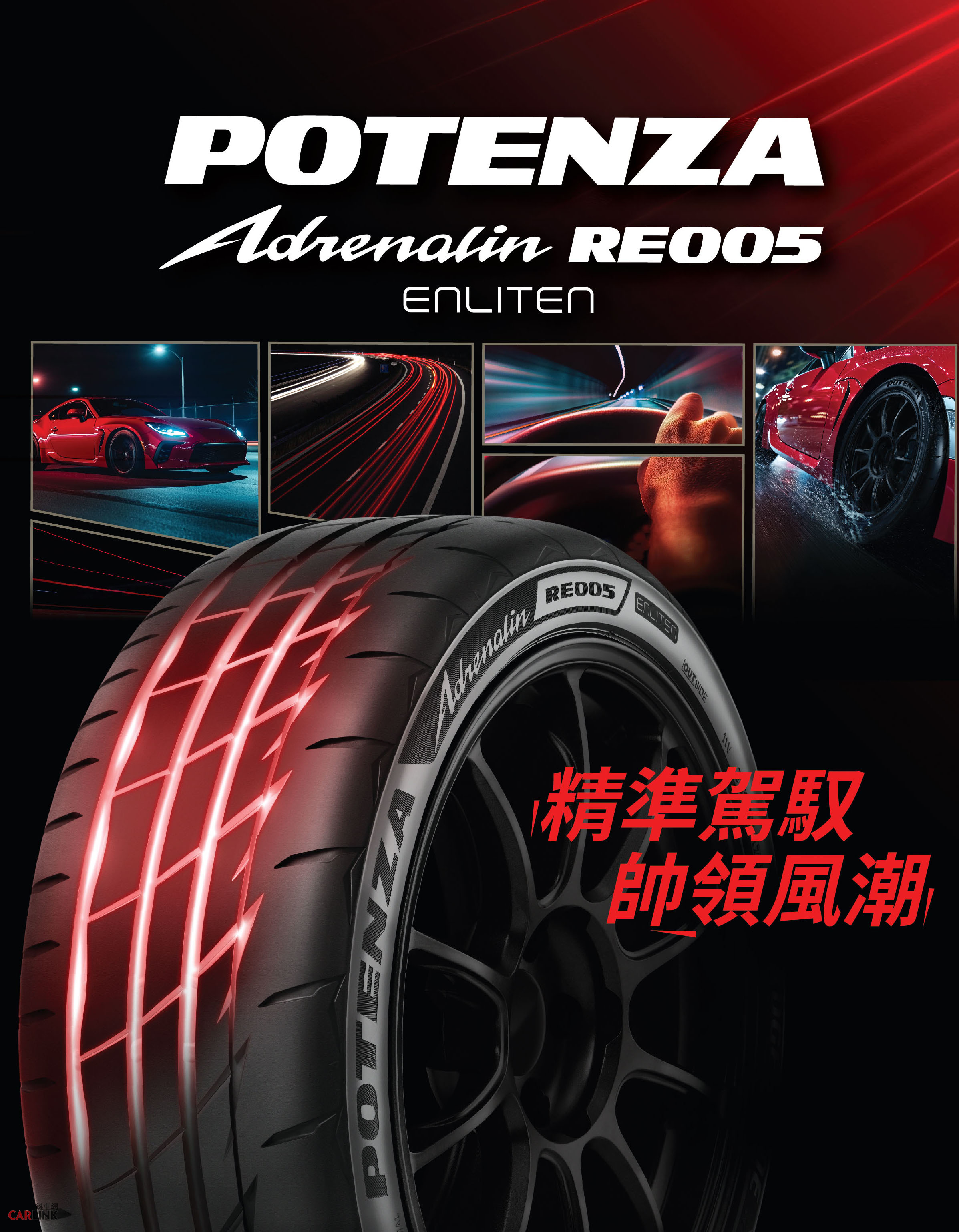 台灣普利司通正式推出旗艦運動胎系列最新產品——BRIDGESTONE POTENZA Adrenalin RE005。承襲普利司通深厚的賽車運動基因,POTENZA 系列長期以來作為高性能駕馭的代表,持續將賽道上的熱情與精準駕馭延伸至日常道路上。而其中以「極致駕馭樂趣」為開發理念的POTENZA Adrenalin 系列,更是讓日常駕駛也能感受到高性能運動表現。全新 POTENZA Adrenalin RE005 作為系列最新進化之作,在延續 POTENZA 精神的同時,也滿足現代駕駛者的多元需求。