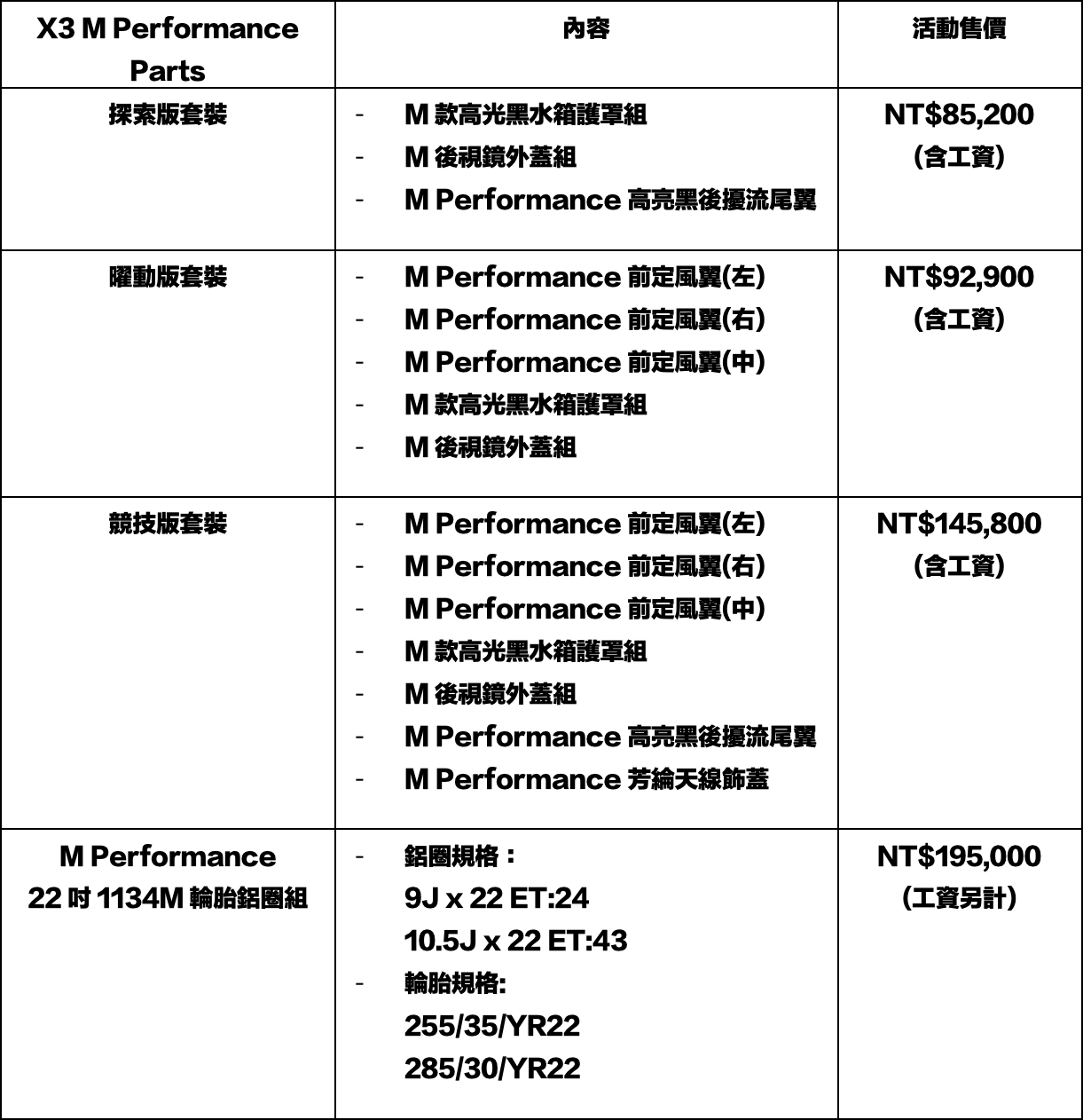 為呼應車主的鮮明風格與自我主張,總代理汎德特別推出「BMW X3 M Performance Parts原廠加裝品特仕套裝」,提供「探索版」、「曜動版」與「競技版」三大專屬升級方案,並同步提供22吋M Performance鍛造鋁圈套件,讓車主依循自身風格,自由勾勒專屬的性能美學.....