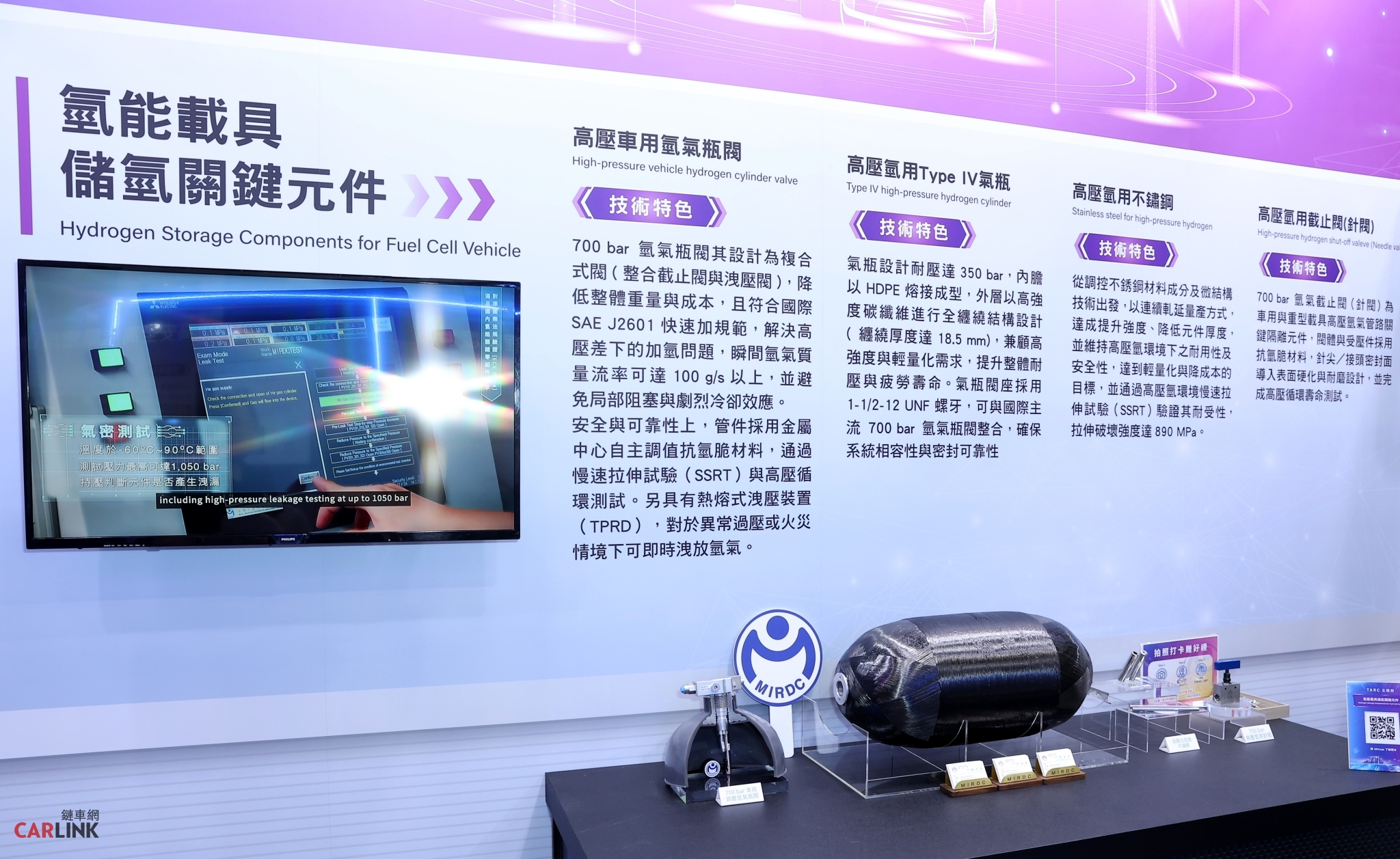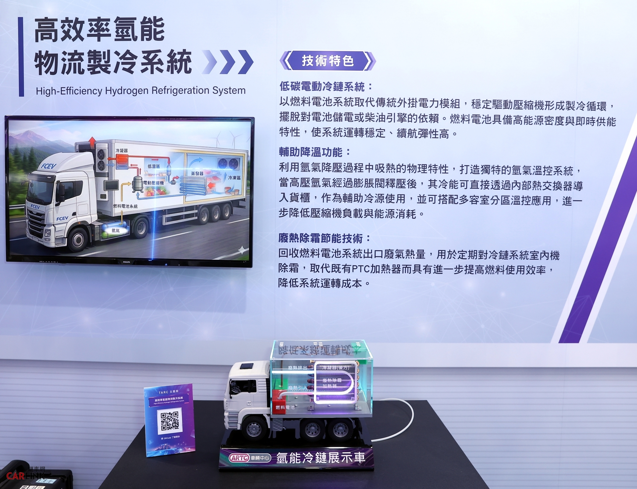針對淨零排放趨勢,TARC主題館展出台灣首輛「16噸城際型氫能巴士」。該車提供長途運輸純電動車(BEV)載重受限與充電耗時的解決方案,具備「加氫15分鐘,巡航續航力可達420公里」的高效能 。這輛氫能巴士展現了高度技術整合的供應鏈,核心系統包含:燃料電池與電力轉換(工研院、台達電)、動力馬達(捷能動力)、鋰電池(台塑新智能)、車體底盤(順益、氫谷動能);電子控制系統包含:混合電力/整車/儲氫控制器(科飛、氫谷動能、工研院)及駕駛輔助模組(研華科技)等 。該車未來將促成氫谷動能取得首張UN R134氫能整車國際認證,助力臺灣從零件出口轉向整車系統整合輸出,與純電商用車並行,搶攻全球綠能減碳市場。